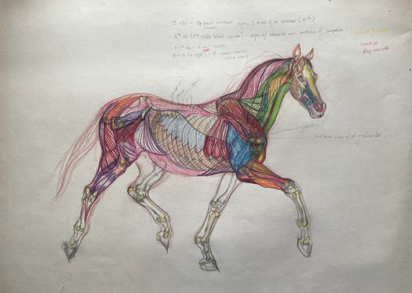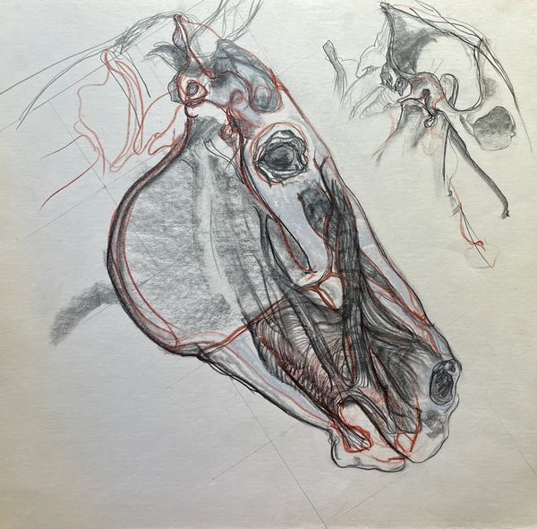 Graphite and Conte' Crayon study of facial muscles and skeletal poll detail of horse.