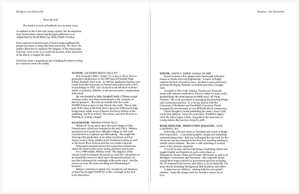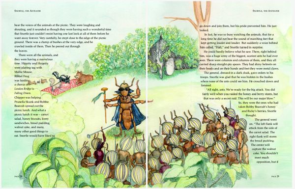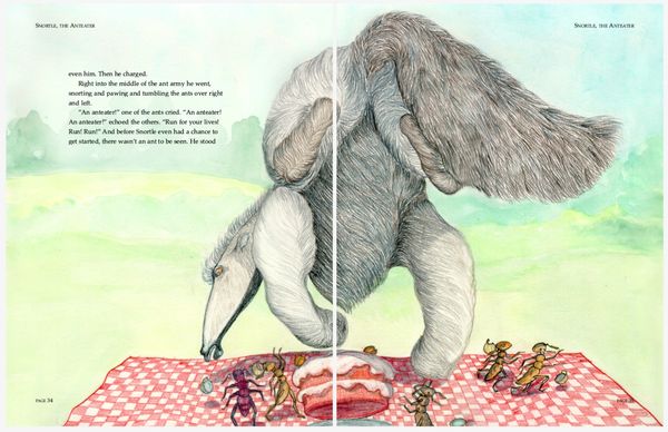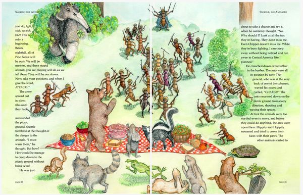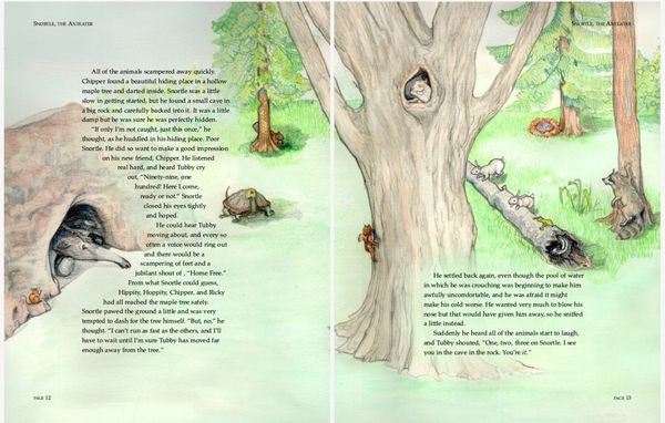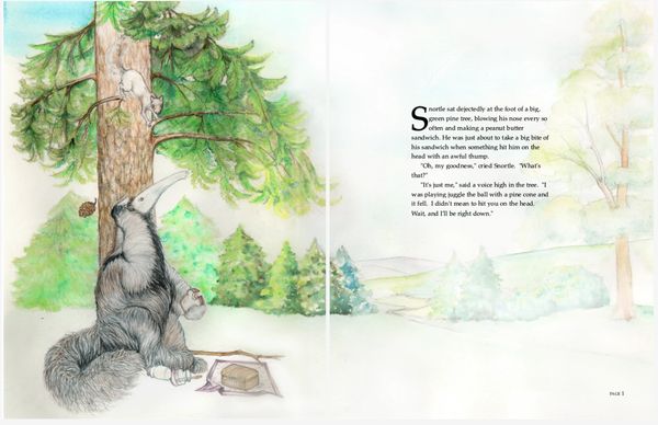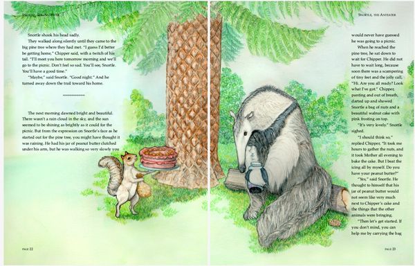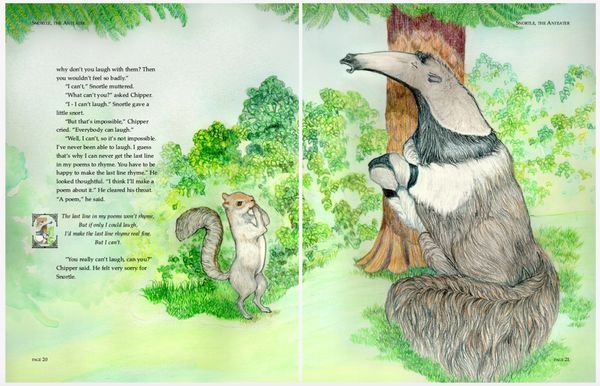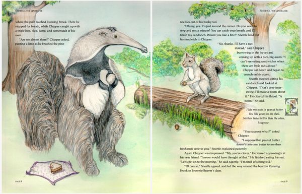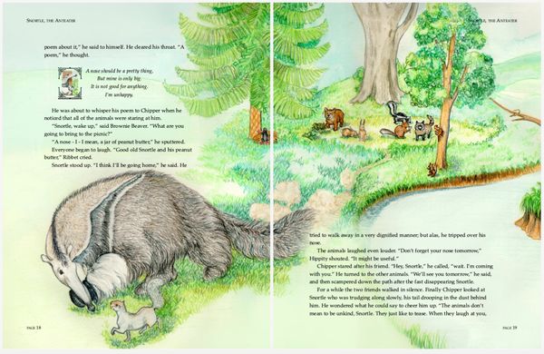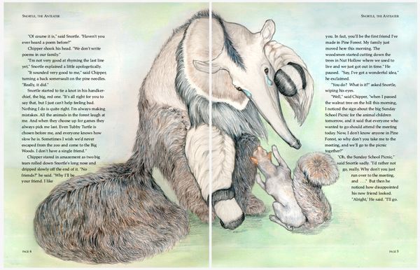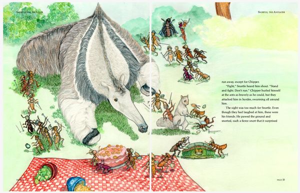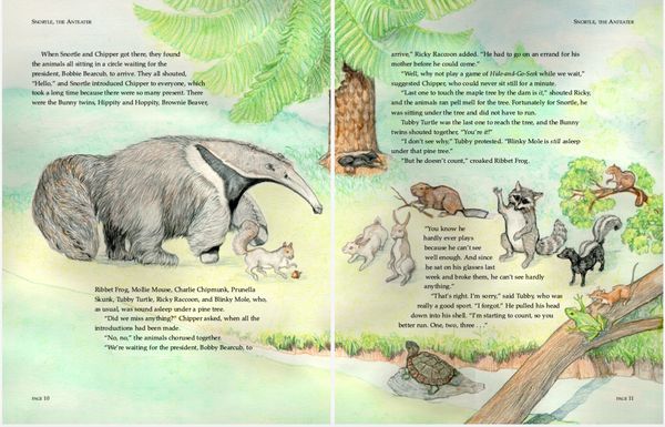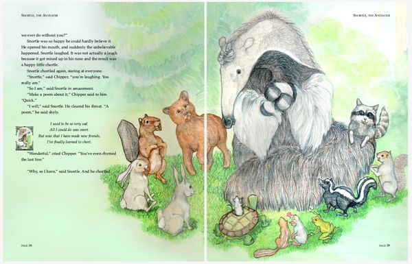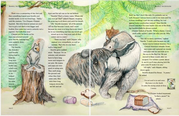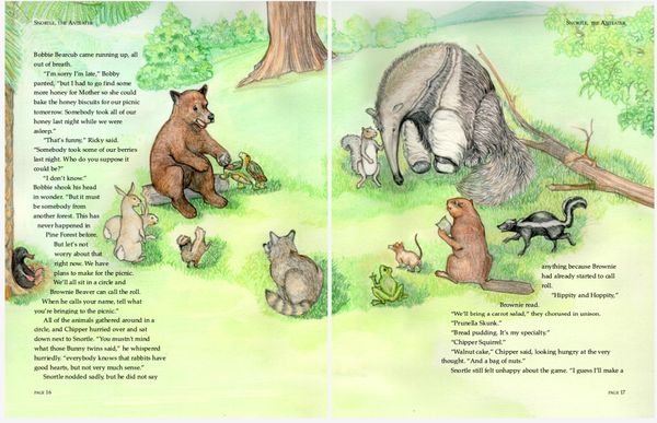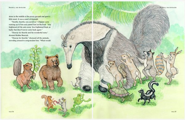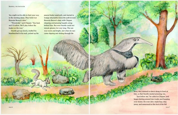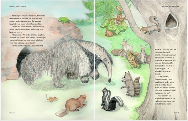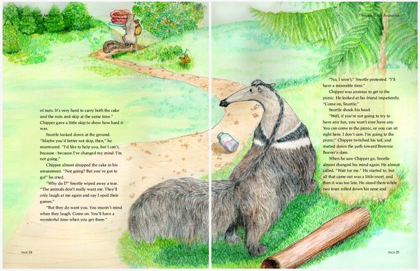 Colored pencil illustrations for a 39 page book , plus front and back cover, featuring the adventures of an errant aardvark and the native woodland creatures in his new home.