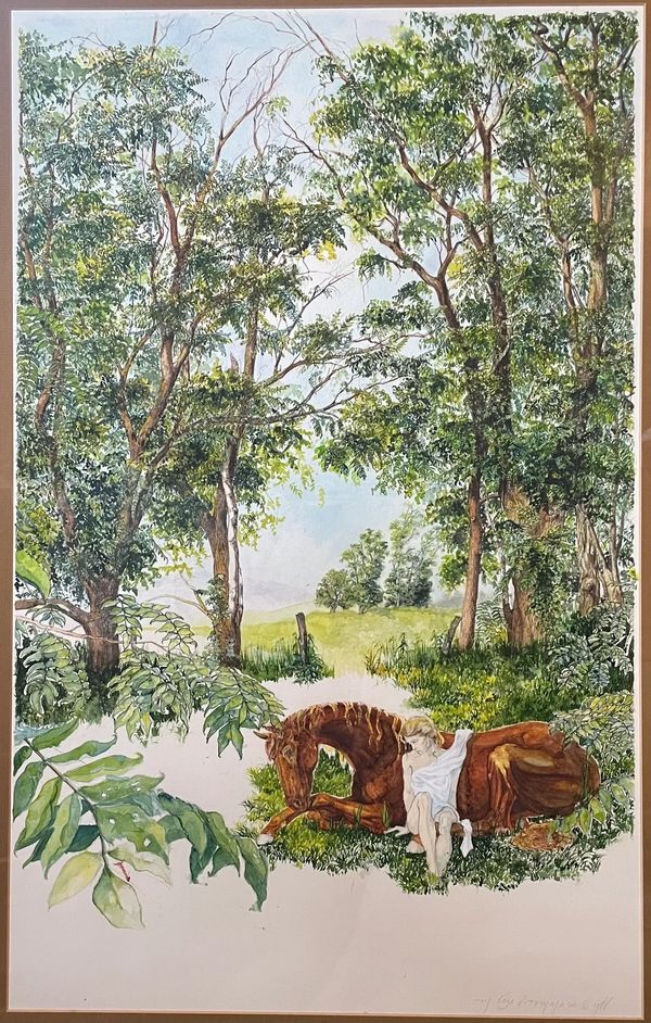 Creation of an equine commissioned portrait documented throughout the process; horses set in a landscape - WC pencil and colored pencil on paper.